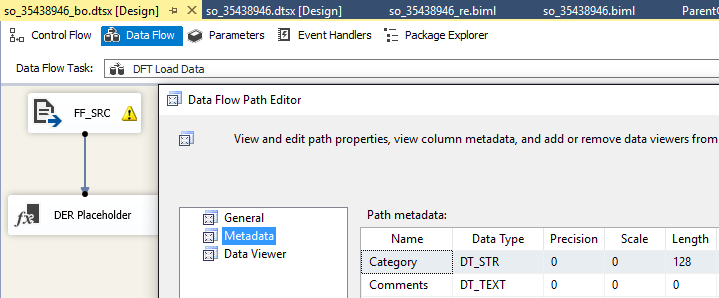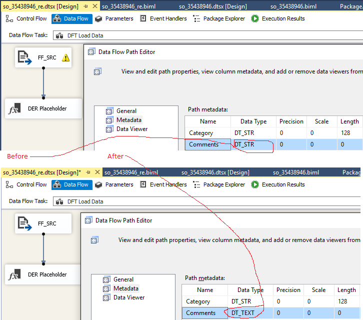 我真的很困惑,希望斯科特能参与进来。发出的DTSX看起来像前屏幕截图,数据类型为DT_STR,长度为零。一切都很好,只是看起来很糟。当您双击以让编辑器修复它时,它将更改为DT_TEXT。