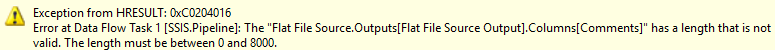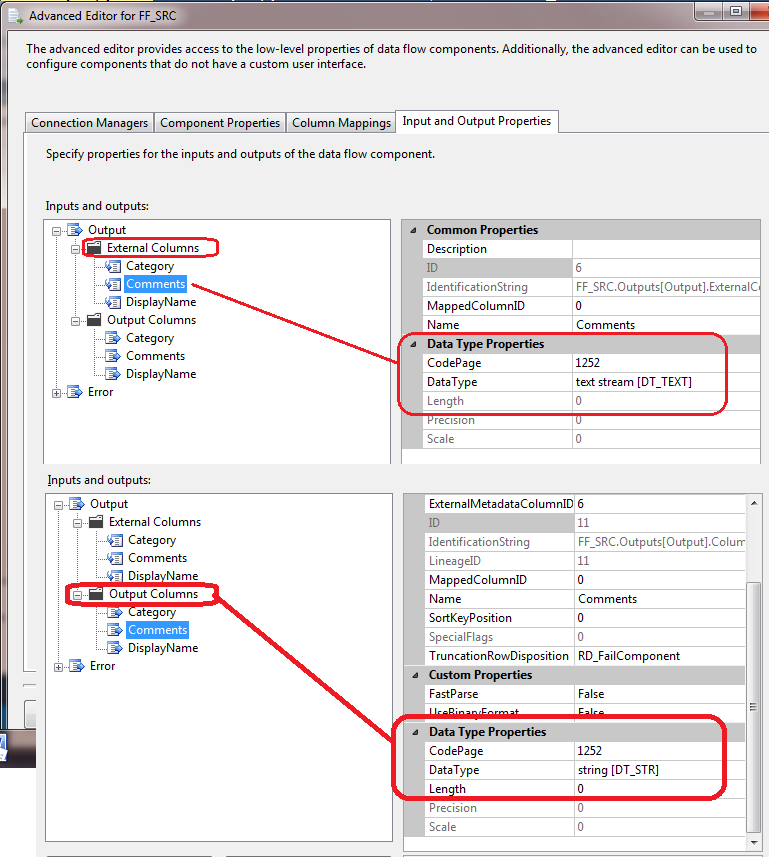 当我检查平面文件源组件的高级选项时,我可以看到列Comments的数据类型不同,外部列显示为DT_TEXT,其中输出列显示DT_STR。:(