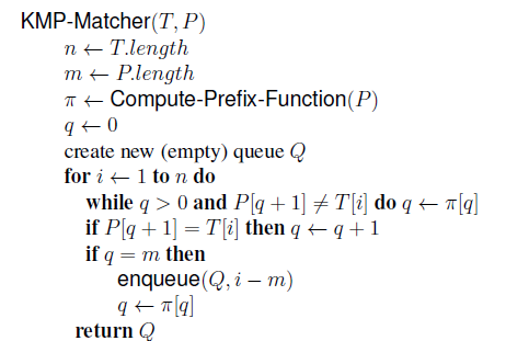 public static Queue<Integer> KMPMatcher(String T, String P)