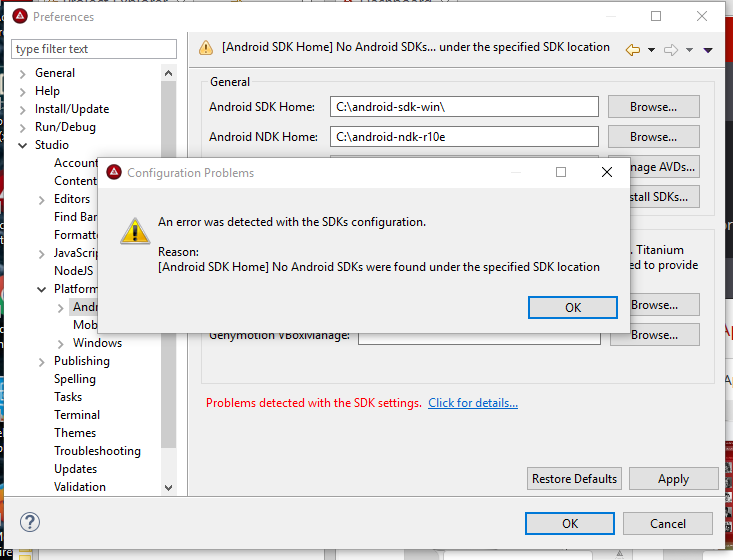 几天前,Appcelerator在我的Windows 10 PC上工作得很好。今天,当我试图构建我的应用程序时,我会收到错误消息。突然,Appcelerator在我的机器上找不到Android。