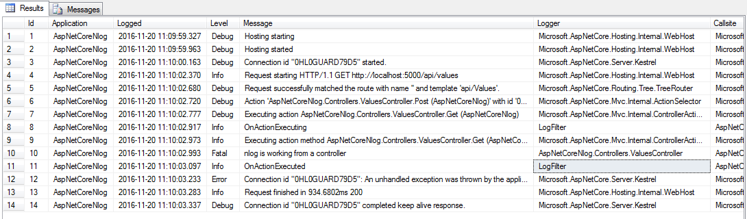 看看Damienbod在https://damienbod.com/2016/08/17/asp-net-core-logging-with-nlog-and-microsoft-sql-server/的博客。