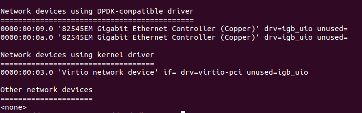我已经在我的Virtual上设置了DPDK和Pktgen,两个只有主机的适配器。这两个NIC由DPDK管理。
