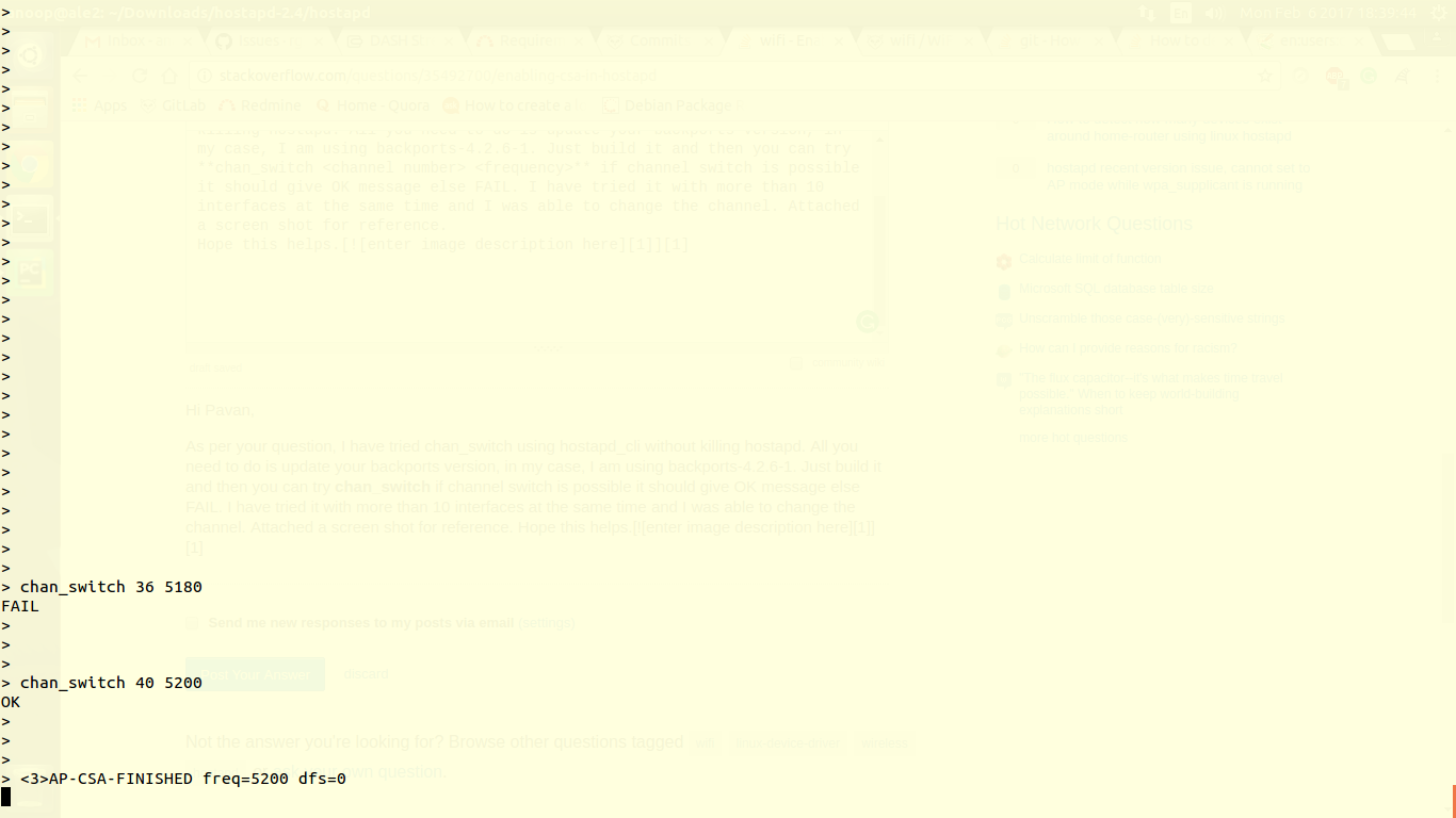 根据您的问题,我尝试过使用chan_switch使用hostapd_cli,而没有杀死hostapd。您所需要做的就是更新您的backports版本,在我的例子中,我使用的是backport-4.2.6-1。只需构建它,然后您就可以尝试chan_switch,如果信道切换是可能的,它应该会给出OK消息,否则失败。我已经尝试了10多个接口,在同一时间,我能够改变频道。附上一张屏幕快照以供参考。希望这能帮上忙!