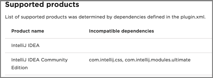 造成这种差异的原因根本不是缺少URL,而是网站上列出的许多插件没有为Community启用,所以它不会显示它们。https://plugins.jetbrains.com/plugin/6610的plugin就是一个例子。虽然该页面没有明确说明它需要终极版,但您可以通过滚动到更新列表并单击(最新的)版本号来查找。在这里,您会发现一个受支持的产品列表,其中Community被列为不兼容的,因为插件需要“终极”模块(一个只包含在IDEA终极版中的模块)。
