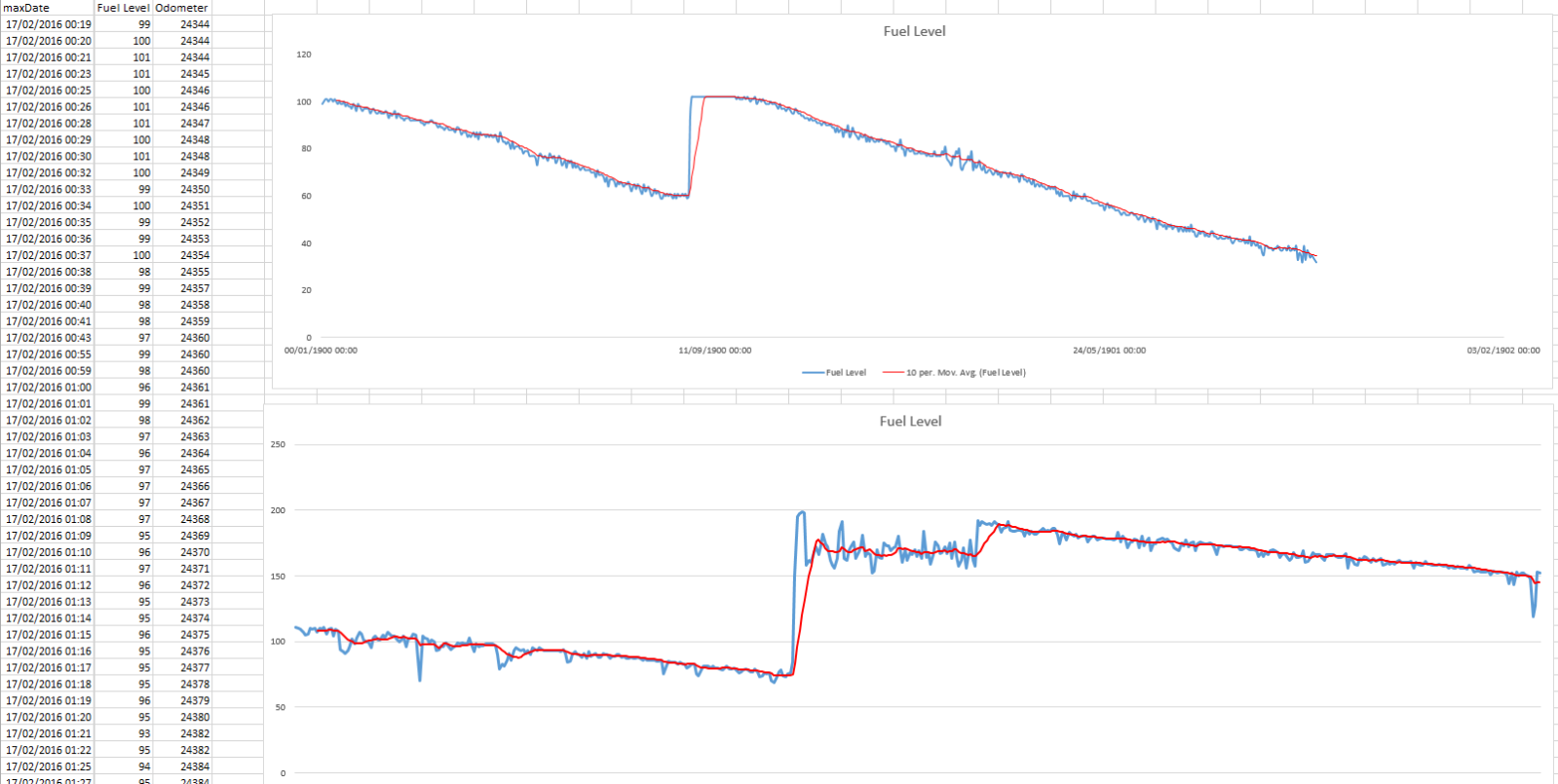 有时会有一个长时间的尖峰(有时在加油后看到),那么燃料水平就会像你预期的那样线性下降。见下面的第二张图表。