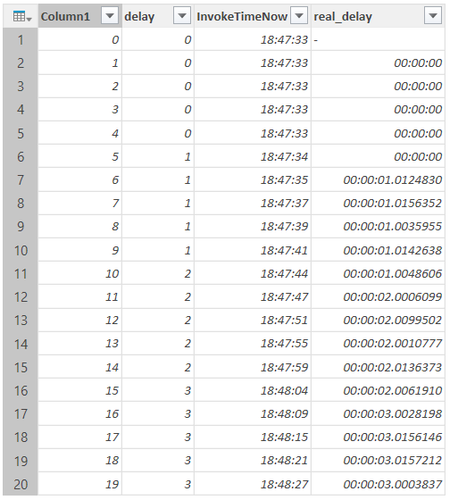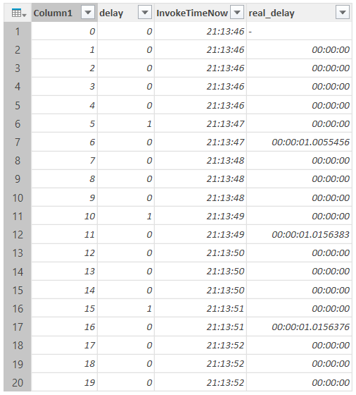 InvokeAfter = Table.AddColumn(delay, "InvokeTimeNow", each Function.InvokeAfter(()=>DateTime.Time(DateTime.LocalNow()), #duration(0,0,0,[delay]))),