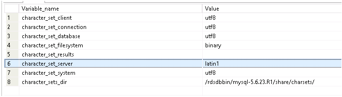我想也许character_set_server是问题所在?这是latin1,我不能把它改成utf8,我该怎么做呢?我正在使用amazon,在参数组下面我看到了utf character_set_server,所以我不明白为什么上面没有utf8。