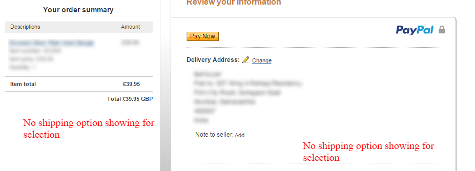 我正在使用贝宝专业快递结帐在magento 1.6,当我尝试贝宝快速结帐从购物车或产品页面,其重定向到贝宝页面,但没有显示在贝宝页面中显示的选择运输方法。