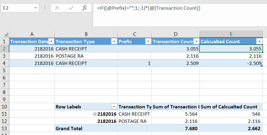 =IF(columnWithPrefix=1,-1,1)*columnWithTransactionCount)然后您可以选择整个表,然后单击菜单Insert,然后单击Pivot Table。之后,这仅仅是你根据个人喜好格式化桌子的问题。下面是一个基于示例数据的简单解决方案。