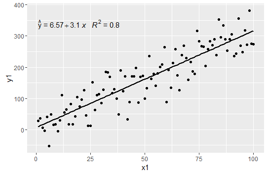 geom_point()我们使用eq.with.lhs=FALSE关闭y=的自动包含,然后将hat(y)放在前面(带有等号)。注意,格式来自?plotmath帮助页面。