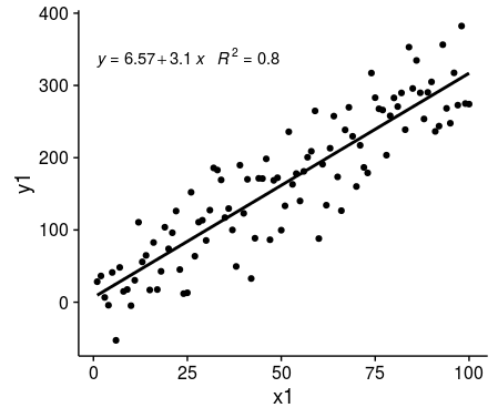 df$y1 <- 2 + 3 * df$x1 + rnorm(100, sd = 40)