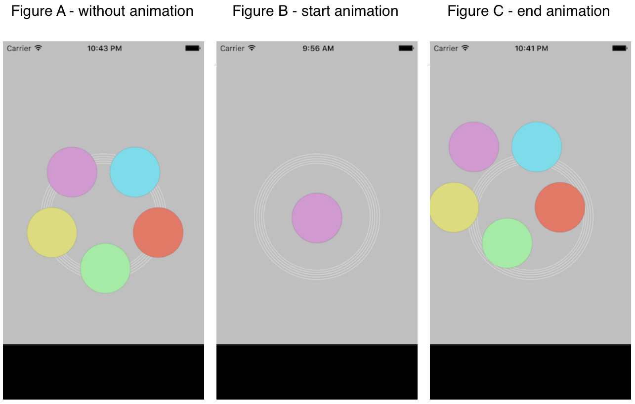 最初,我的ViewController将五个UIButtons以编程方式放置在圆周上(即没有XIB文件),如图A所示。在修改我的应用程序时,我引入了snap动画,将UIButtons从中心点移到位置。图B显示了动画开始的中心点。图C显示了五个UIButtons,它们在动画完成后被替换,尽管用于snapToPoint:的CGPoints与用于放置UIButtons的CGPoints完全相同。