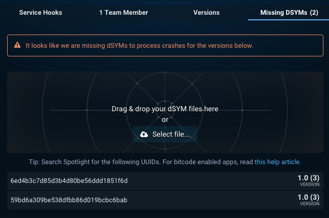 如果您发现dSYM没有被选中,您可以手动添加它们,方法是转到您的应用程序设置页面,选择一个应用程序,然后单击“缺失dSYMs”选项卡上传dSYM。