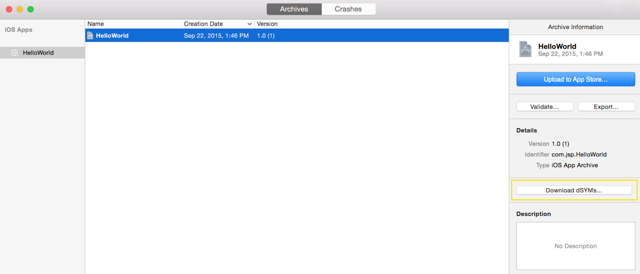 启用Bitcode的应用程序需要从Xcode下载它们的Xcode,然后将其上传到Crashlytics,以象征崩溃。支持比特代码的应用程序的DSYM可以从Xcode的组织者下载。选择应用程序的特定存档,然后按下“下载dSYMs”按钮,它将把编译好的Bitcode dSYMs插入到原始存档中。