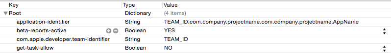泰姬..。清理您的构建,转到info.plist,删除旧的包标识符键,并将您的密钥只插入一次info.plist,并从设置中设置团队名称并选择配置文件。重新建造..。