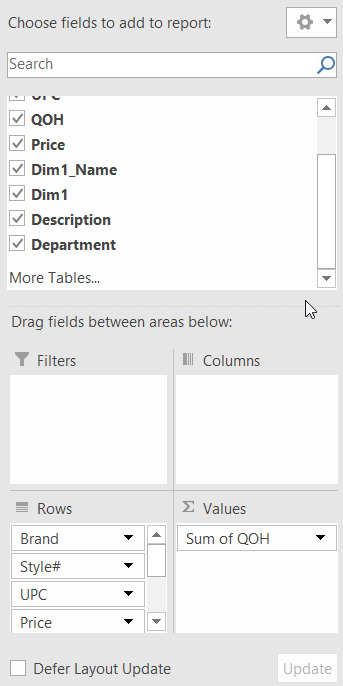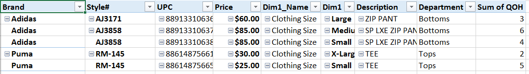 创建一个枢轴表,拖动品牌,风格,UPC,价格,Dim1_Name,Dim1,描述,部门进入行区域。将QOH拖到值区域中,在该区域,它将默认为求和。