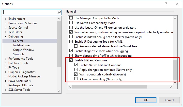 我希望启用编辑,并在调试时继续编辑代码。我的VisualStudio2015终极版没有Options>Debugging中的设置。我看到了一些关于禁用Intellitrace的页面,但是这个选项也不存在。为什么会这样呢?