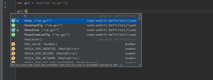 Official libraries更改为Typescript community stubs。node-webkit。这是nw.js的旧名字。据我所知,nw.js没有存根。下载并安装。manage scopes。Library下面目录右侧的空间。确保检查了node-webkit。这样,我就能够解决依赖关系,并为nw.js获得代码完成。虽然它可能很旧,但至少是有意义的。