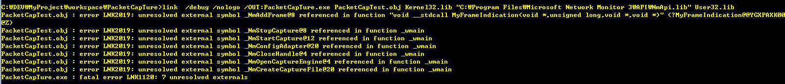 在VS 2013中,我在编译/链接NetmonAPI时遇到了问题。API随安装而来。Networkmonitor甚至在“帮助”中解释了如何让它在VS中工作。我按照说明如何设置它,尝试了一个帮助的例子,但失败了。我总是得到七个符号的"LNK2019"错误。