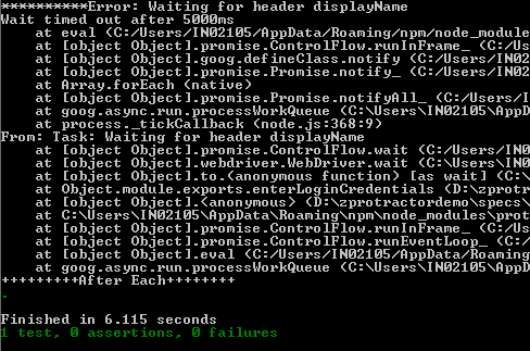 测试失败时出现错误-- browser.wait()引发的超时错误。当一个测试因为错误而没有通过,而不是由于期望失败,这是相当正常的情况。我们通常只是提供一个有意义的错误消息来简化调试: