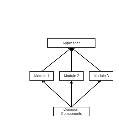在下图中,我有3个模块(作为android库),它扩展了基本的“公共组件模块”,所有这3个模块都将添加到一个android应用程序中。所有三个模块都是独立的模块,但当它作为一个应用程序时,它将需要共享一些数据,启动其他模块,并需要更多的相互通信。