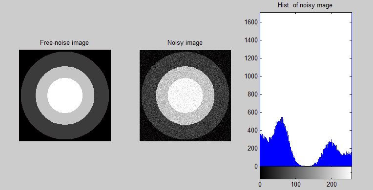 subplot(133);imhist(uint8(255.*im_noise)); title('Hist. of noisy mage');这是我上面代码的图像。谢谢大家