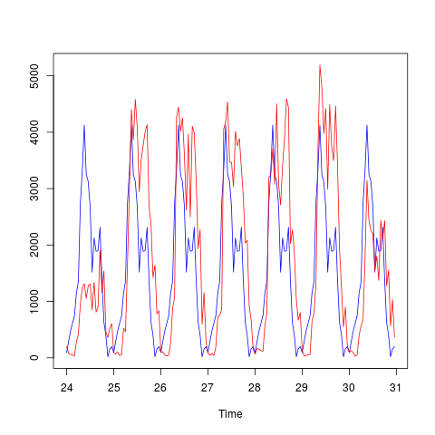 问题是,当时间序列在周六和周日获得最低值时,为什么模拟值不遵循红线呢?是否有一种方法可以获得更高的准确性,让预测更接近观察到的结果?