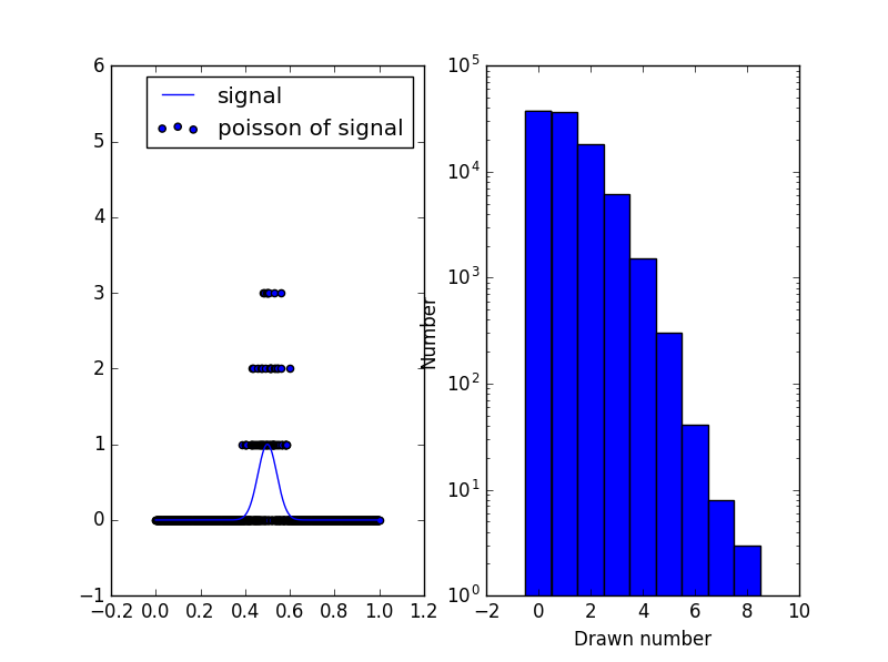 y=exp(-(x-0.5)**2/(2.0*(0.1/(2*sqrt(2*log(2))))**2))峰值在0.5和fwhm=0.1。到目前为止还没什么意思。在下一步中,我使用numpys random.poisson实现计算数据集的泊松分布。