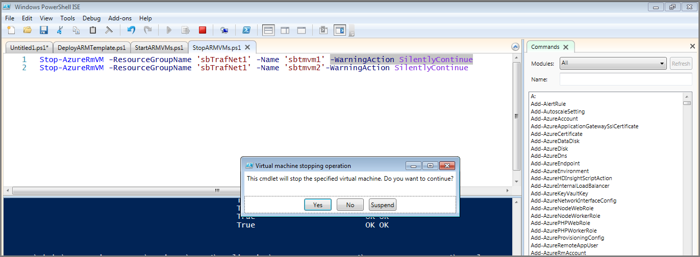 当我试图使用AzureRMVM(新的ARM one)在Azure上停止虚拟机时,我得到了如下所示的消息框。这有问题,如果我在批处理语句中运行此语句,我将为VM关闭的每个语句获得这个消息框/提示符。我该怎么压制这一切?