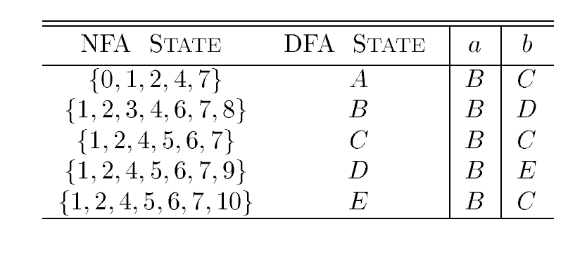 我所遇到的问题是,当我在{0,1,2,4,7}中的州中,只有2和7向a、move(A,a) ={3,8}和e-closure({3,8}) ={1,2,3,4,6,7,8}过渡时,我无法理解如何在DFA状态B、C、D和E中得到NFA状态。My problem is how do we end up with {1,2,3,4,6,7,8}和NFA声明如下。