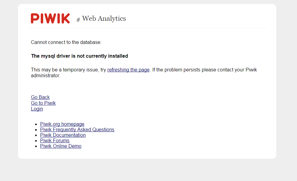 我试过他们的支持论坛,但是那里很安静。建议查看以下文件piwik/config/global.ini.php并检查是否定义了数据库驱动程序。我的配置文件包含以下内容;