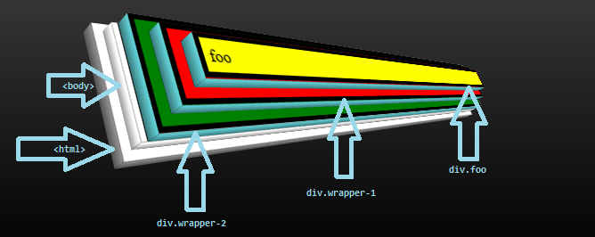 此外,div.wrapper-1据说是div.wrapper-2的一个子元素,尽管1按数字顺序排在2之前,但div.wrapper-1样式出现在它们的父元素div.wrapper-2的顶部。同样的父子关系适用于div.wrapper-1和<div>foo</div>.