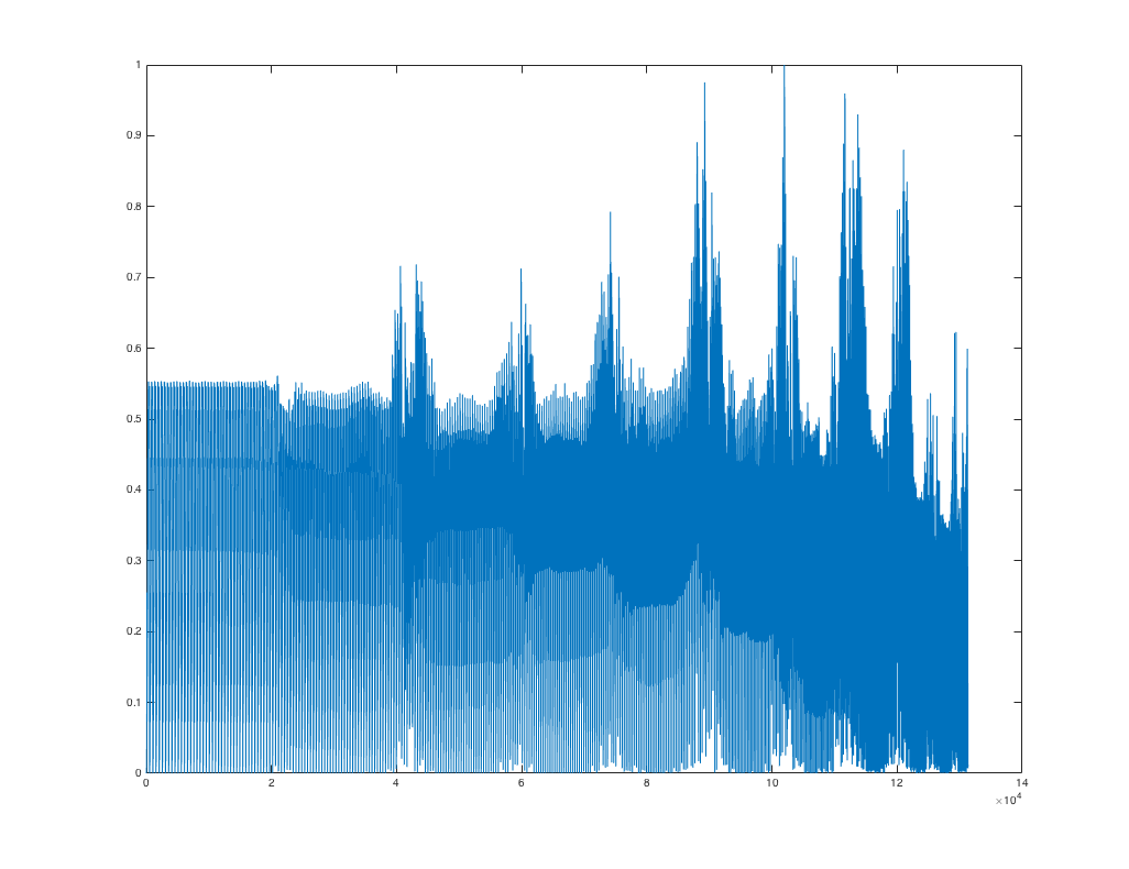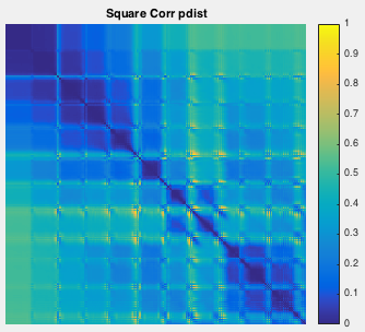 我看到了大约3-5个趋势,我想更好地想象。我认为plot可能不是这里的最佳选择。它的imshow(squareform(pdist(data, 'correlation'))) (相当于imshow(squareform(pdist(data, 'correlation'), 'tomatrix')))是基于丹的answer的以下内容。具有归一化pdist值的图像,即imshow(squareform( mat2gray(pdist(data, 'correlation')), 'tomatrix') ); colormap('parula');