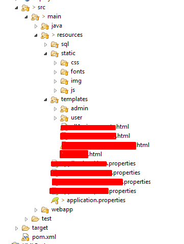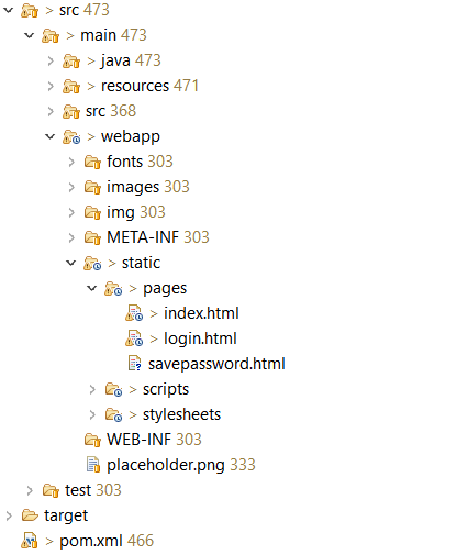 在我看来,最好将*.HTML文件与所有静态CSS字体一起放在资源文件夹中,如下图所示。在webapp中,您可以只有一个WEB文件夹。