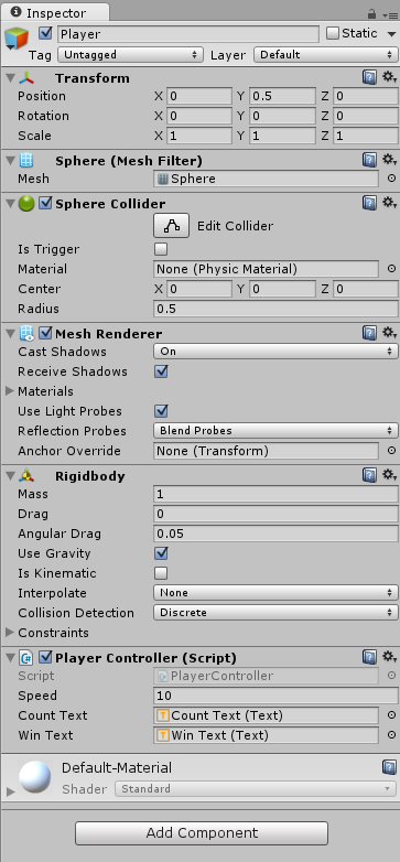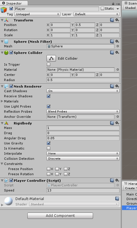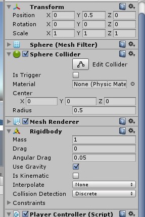 好像你还没有把刚体组件附加到你的球体上。添加它并取消选中“使用重力”复选框。