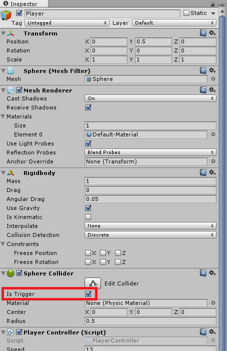 你让你的球对撞机有一个“触发对撞机”,这意味着它不会“击中”其他物体,而是会通过它。确保您取消选中,“是触发器”框中的播放器和游戏场。