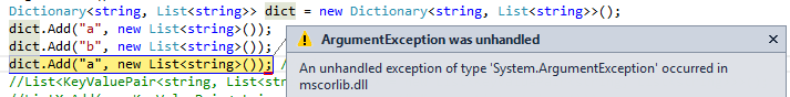dict.Add("a", new List<string>()); //will throw an error图片: