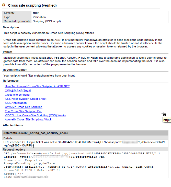 https://myapp.com:443/referentiels-web/authfailed.jsp;jsessionid=83A16DB68D05ECF865408DAC009A0DAF?ticket=ST-1664-V7HlBALHdSMeqYmAjHL9-passeport01.brgm-rec.fr'"()&%<ScRiPt>alert('test')</ScRiPt>或者是编码的,比如: