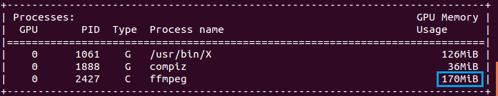 我在Ubuntu中在NVIDIA QUADRO K4200上转换视频(ffmpeg版本为2.7.1,NVENCSDK5.0.1)。一个流的GPU内存使用量为100 MB。请参阅nvidia-smi命令的输出: