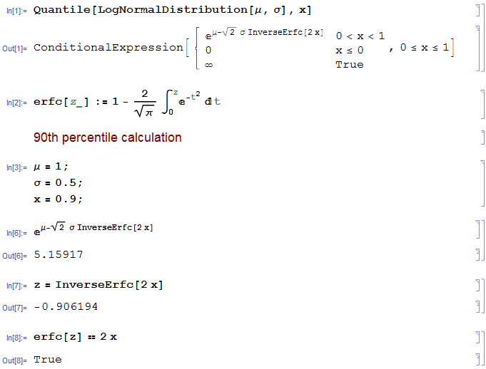 Quantile[LogNormalDistribution[μ, σ], 0.9] == p90}, {μ, σ}]{ -> 1.,σ-> 0.5}