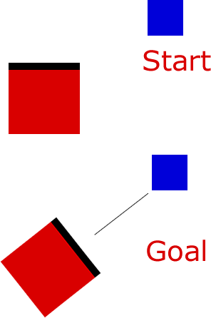 要计算出旋转正方形的角度,你需要使用一些三角函数。首先,我们计算出正方形中心之间的垂直距离和水平距离,然后求出逆切线,得到需要旋转的角度。我猜你想让最上面的边框朝向蓝色的广场。