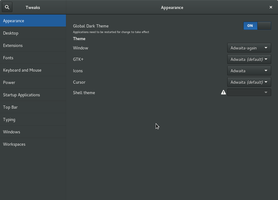我正在使用一个定制的深色秋千外观和感觉,唯一真正烦人的是,标题栏(原生Gnome)是非常明亮的。我已经使用了微调工具来使用Adwaita系统,但是对于不明确支持暗主题的应用程序(例如Iceweasel、Icedove、Gimp、Libre Office,.),这并不适用。