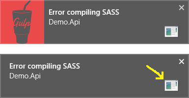 我正在使用node-notifier (链接)在node.js中显示在Windows 8中的敬酒通知。我让它正常工作,并且能够调整通知中的标题、文本和主图像。然而,在Windows 8的吐司通知中,有一个次要的(较小的)映像。见下文: