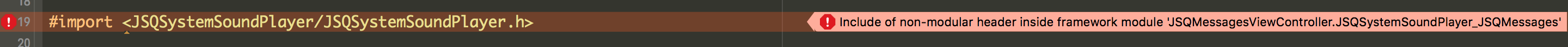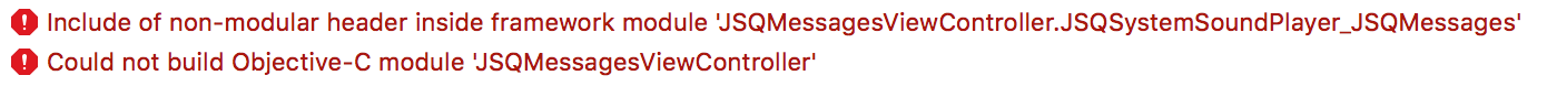 我想使用JSQMessagesViewController作为对我的快速吊舱的依赖。当我构建我的示例应用程序时,我得到了与JSQSystemSoundPlayer相关的旧的非模块头错误,但是我不知道如何使用XCode 7绕过它。