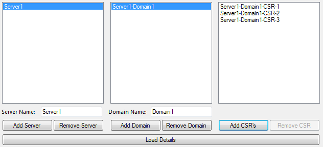创建一个封装Server及其详细信息(如Domains和Csrs )的类。创建一个Servers列表并将其绑定到第一个列表框。然后将其他两个列表框绑定到第一个列表框的当前选定项。最终结果可能如下所示: