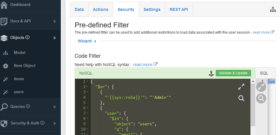 Backand中基于角色的安全性将帮助您构建多租户应用程序,包括对象级安全性和预定义过滤器。对于多租户,预定义的过滤器是非常重要的。它允许您对不同的租户使用相同的对象,并对数据进行过滤,以便每个租户被隔离。预定义的筛选器是一个NoSQL或SQL语句,它总是在服务器中运行并过滤数据。在Backand中,您可以自动创建只过滤请求用户创建的数据的语句。您需要确保所有对象都与users对象相关,这样这样的过滤器语句才能工作。下面是一个自动生成的NoSQL示例,它筛选特定用户的所有项,除非用户具有管理角色: