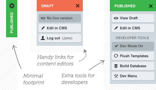 您可能会看到https://github.com/jonom/silverstripe-betternavigator模块,它在右上角显示了一个漂亮的红色(草稿)或绿色(活动)状态栏(以及一个方便的菜单,例如编辑此页面):