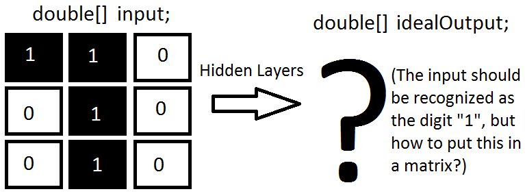 我想用Java的神经网络(恩奥克)实现数字识别。为此,一旦识别过程开始,我将在输入层的相同大小的矩形中对屏幕进行分区。唯一的问题是,当我只想识别介于“0-9”之间的数字时,我并不完全确定输出层应该是什么样子(见下图)。