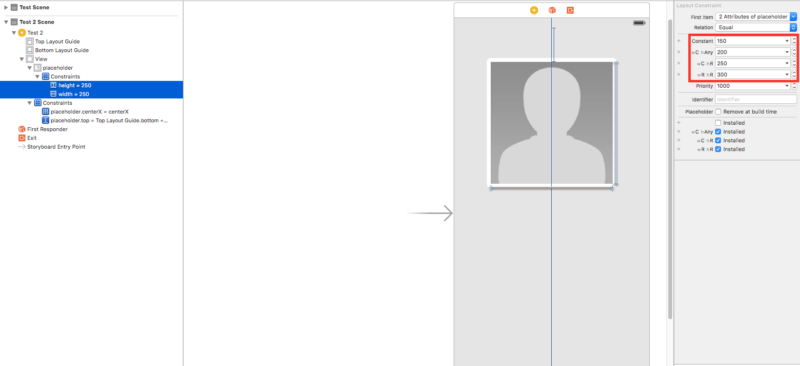 在上面的图片中,请看一下右侧的红色框,在这里,我为三个大小类( height & height any、width compact & height regular、width regular & height regular )添加了多个值。