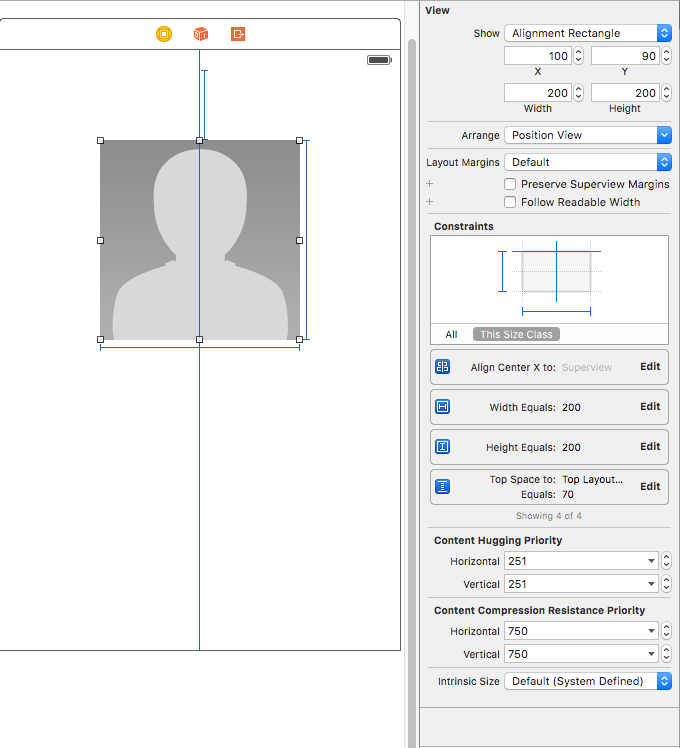 关于大小类的问题:当我在模拟器或设备上运行应用程序时,从iPhone-4到iPhone-6,它显示的是分配给& height regular (即250 )的height和width I的UIImageView,其中必须显示带有height的UIImageView和指定给width compact和D49即200的width。